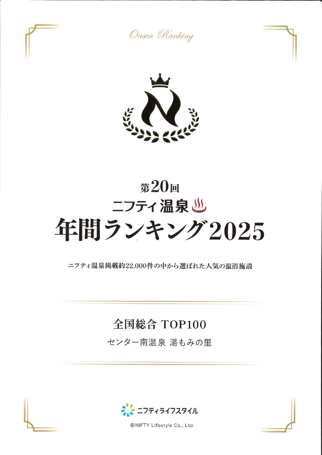 このたび当館は、温泉・スパ情報サイト ニフティ温泉 が発表する「年間ランキング トップ100」に入賞いたしました。